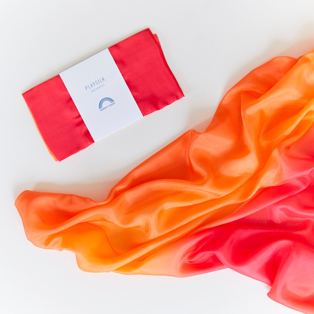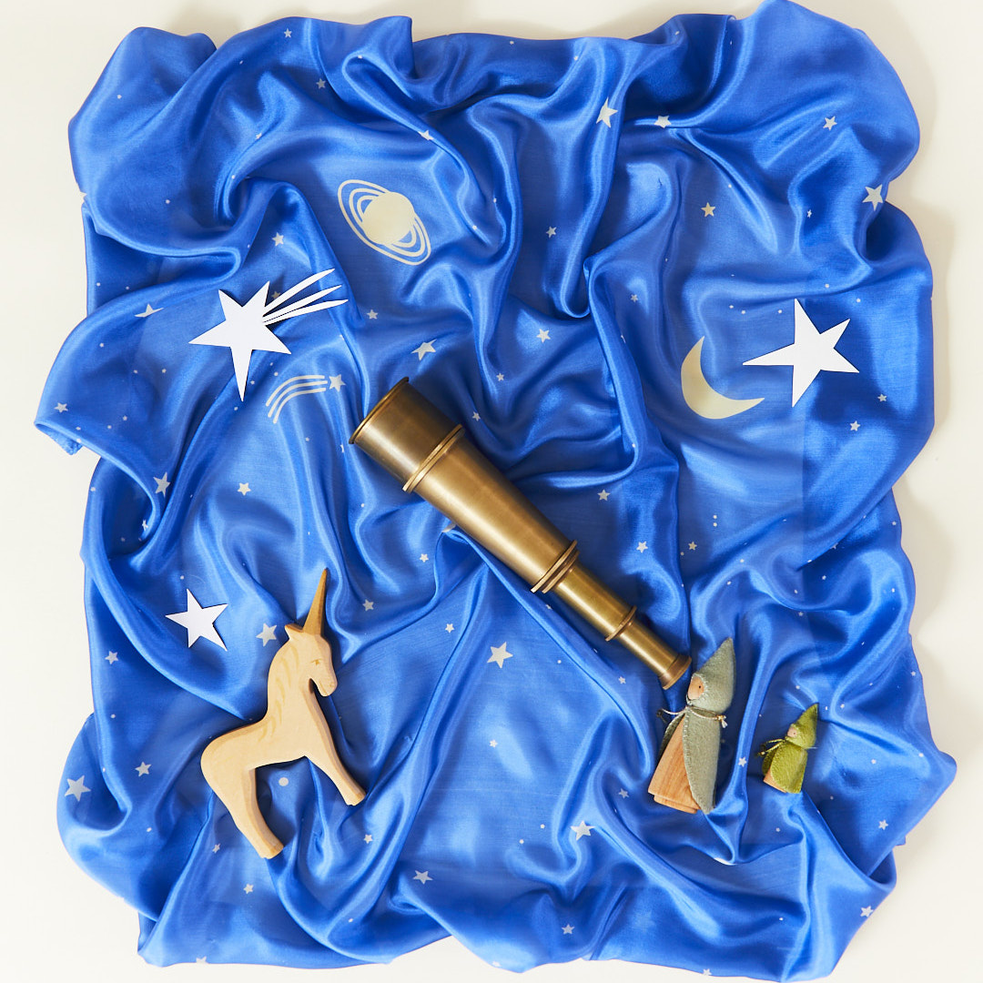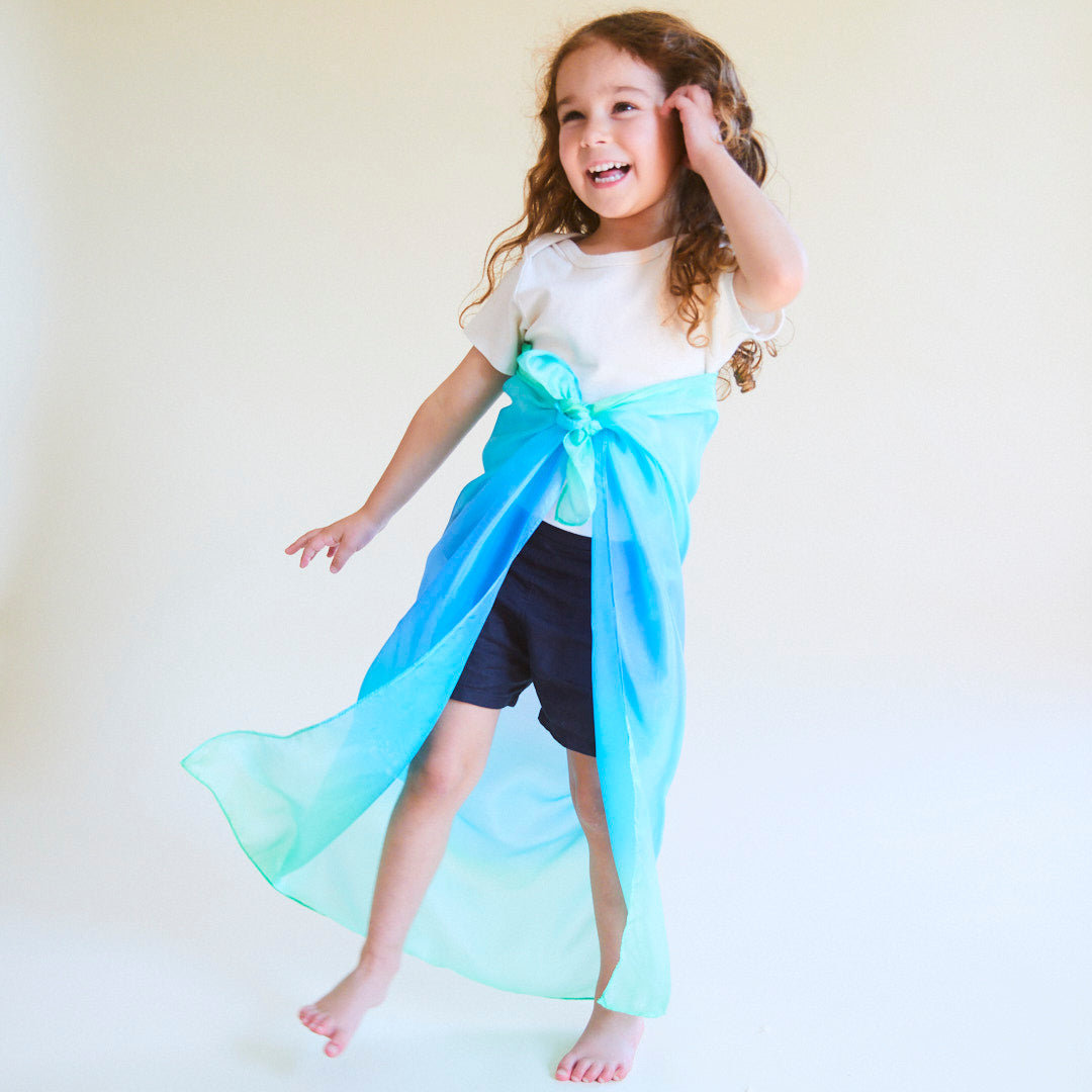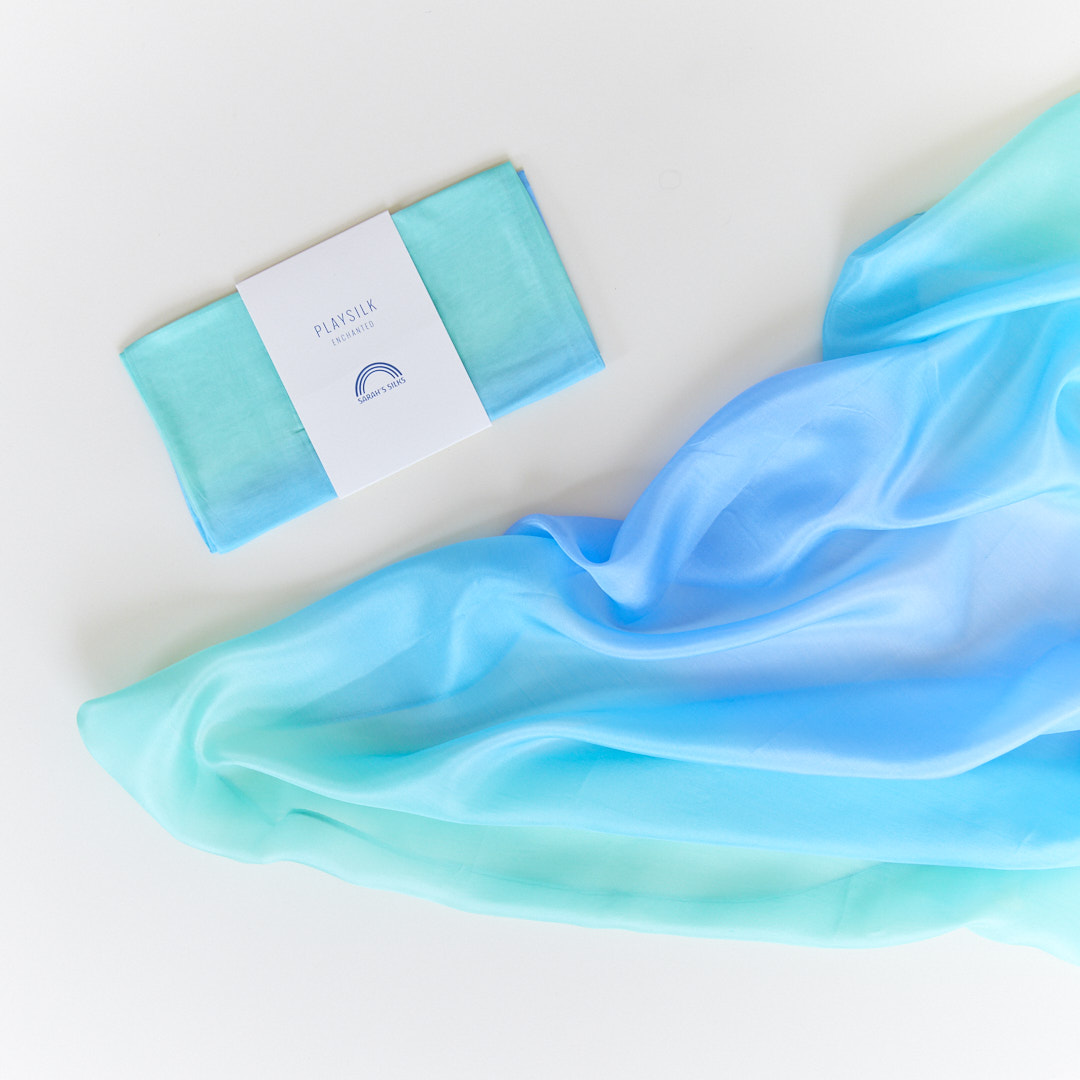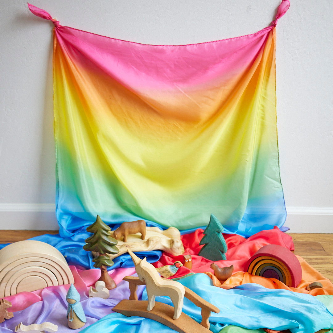 Las Playsilks en tonos encantados son mucho más que un simple trozo de seda. Con su suave textura y colores mágicos, se transforman en lo que tu pequeño sueñe: una capa de superhéroe, las alas de un hada, un río para sus bloques o una tienda de campaña improvisada. Diseñadas para fomentar el juego libre y creativo, estas sedas son un guiño a la pedagogía Waldorf, donde el niño guía su propio aprendizaje a través del asombro y la imaginación.